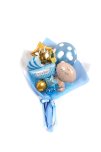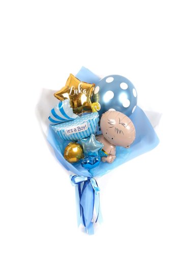 Buket je prigodan za izlazak djeteta iz rodilišta. Dekoracija sadrži 6 mini folija i 1 latex balon puhan na zrak na držačima skupljenim u buket. Na jednom od folijskih balona nalazi se naljepnica sa predloženim imenom.