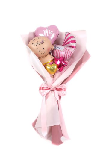 Buket je prigodan za izlazak djeteta iz rodilišta. Dekoracija sadrži 5 mini folija balona napuhana na zrak na držačima skupljenim u buket. Na jednom od folijskih balona nalazi se naljepnica sa predloženim imenom.