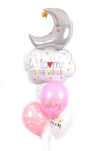 Dekoracija sadrži 5 balona: jedan u obliku oblaka i mjeseca (veličine cca 80 cm) i 4 latex balona s tiskom, iznutra premazani impregnacijskim gelom, kako bi duže letjeli.