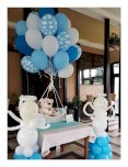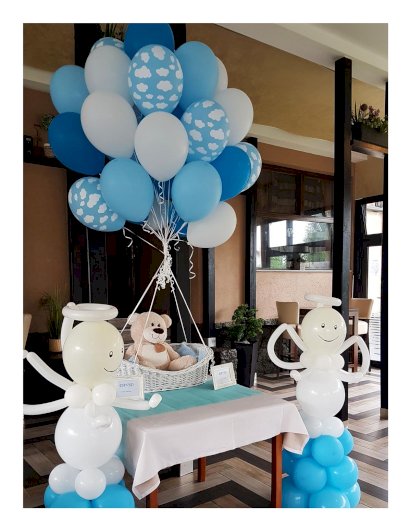 U kompletu dekoracije se nalaze 2 figure anđela napravljene od latex balona puhanih na zrak, dimenzije oko 1,3 m. Između njih se nalazi buntić od 30 latex balona napuhanih na helij i premazanih impergnacijskim gelom (za duže letenje) - medo i košarica nisu u cijeni.