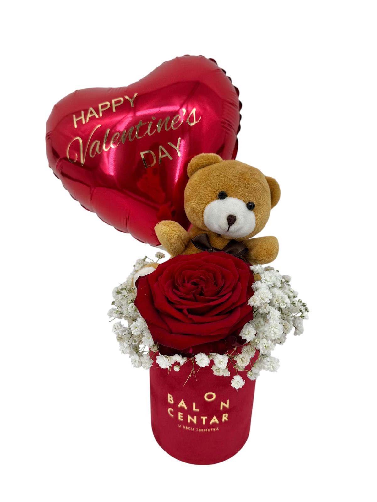 Poklon box s medekom, ružom i šlajerima romantičnog i slatkog dizajna, poseban je poklon za Valentinovo. Spoj nježnih detalja i personalizirane poruke na balonu čini ga idealnim načinom da pokažeš koliko ti je stalo. U napomenu narudžbe slobodno napiši ime ili mini tekst koji želiš da piše na balonu.