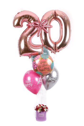 Sastoji se od tri latex balona, jednog folijskog balona u obliku kruga veličine oko 45 cm, te na vrhu od dva broja. Brojevi su spojeni mašnicom od shiny modeling balona. Svi baloni su puhani na helij i pričvršćeni na dekorativni uteg. Uz balone dolazi i prekrasan box cvijeća.