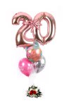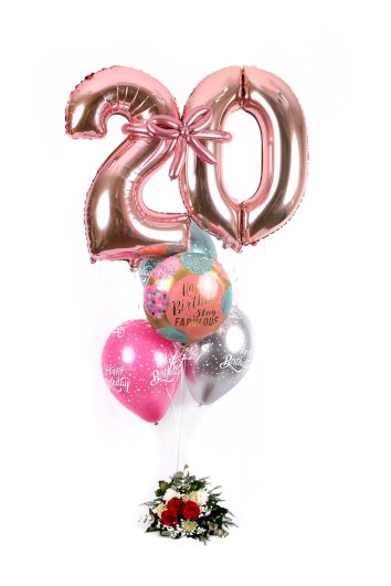 Sastoji se od tri latex balona, jednog folijskog balona u obliku kruga veličine oko 45 cm, te na vrhu od dva broja. Brojevi su spojeni mašnicom od shiny modeling balona. Svi baloni su puhani na helij i pričvršćeni na dekorativni uteg. Uz bunt dolazi i prekrasan buket cvijeća iz cvjećarnice Vanjorek.