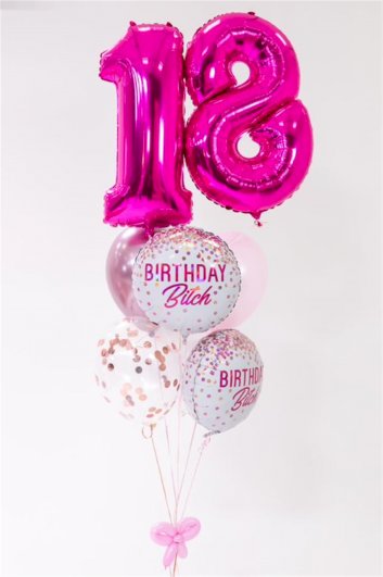 Bunt balona na helij sadrži dva folijska balona u obliku kruga s natpisom "Birthday bitch" veličine 45 cm, te 4 latex balona sa impergnacijskim gelom (kako bi duže letjeli), od kojih su 2 prozirna sa konfetima. Na vrhu buntića nalaze se dva broja veličine oko 66 cm. Baloni su zajedno spojeni dekorativnom mašnom od modeling balona i privezani na ukrasni uteg.