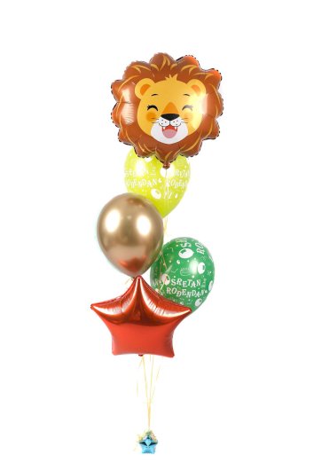 Bunt balona na helij sadrži: 1 folijski balon u obliku glave lava veličine oko 60 cm, 3 latex balona sa impergnacijskim gelom (kako bi duže letjeli) veličine oko 33 cm, te 1 folija balon u obliku zvijezde, veličine oko 45 cm. Baloni su zajedno privezani na ukrasni uteg.