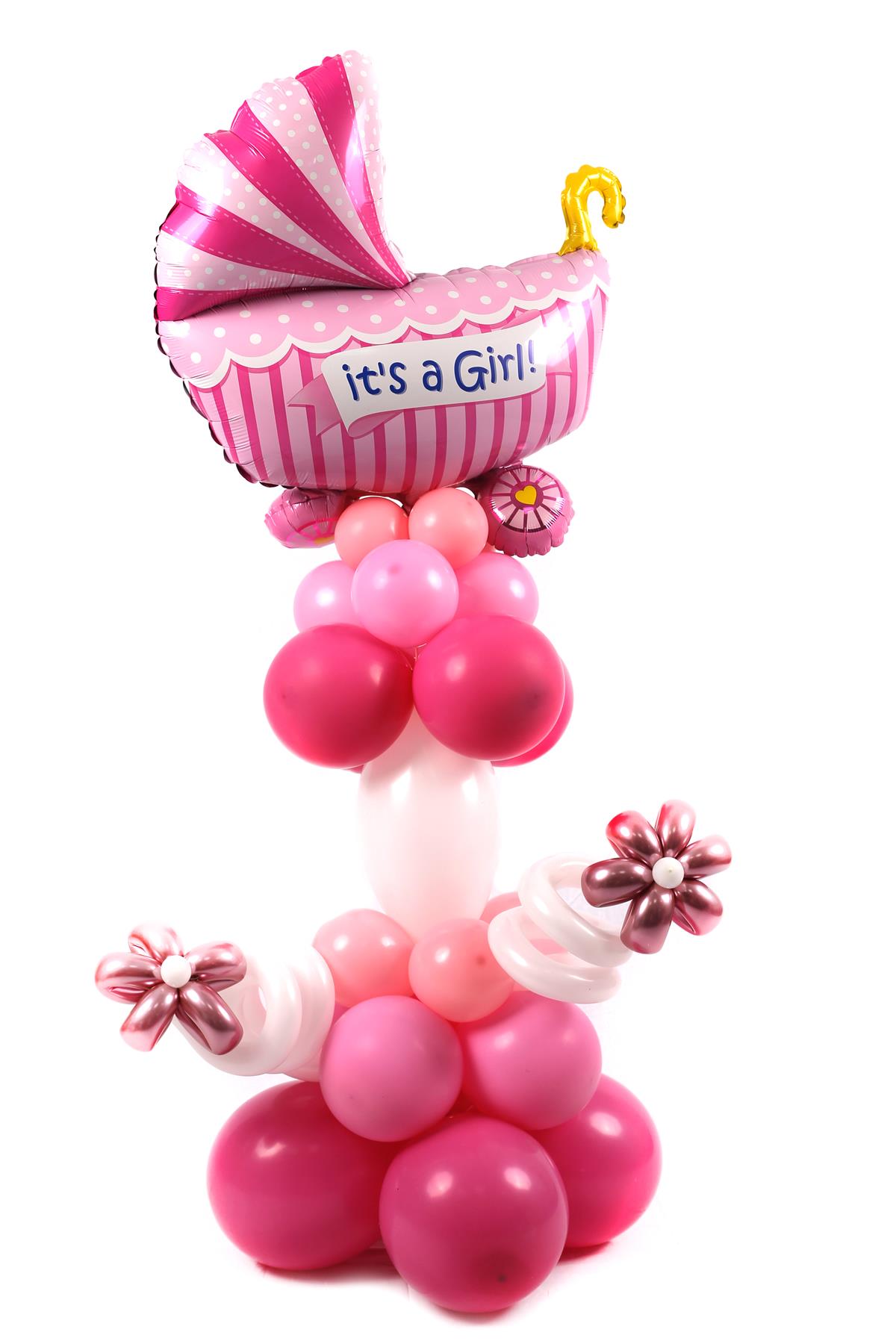 Dekoracija sadrži 1 folijski balon u obliku rozih dječjih kolica, dimenzije oko 80 cm, koji stoji na postolju od latex balona. Latex baloni su puhani na zrak, a folija balon na helij. Postolje od balona ukrašeno je cvjetićima od modeling shiny balona. Dimenzija cijele dekoracije je oko 1,7 m.
