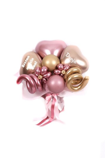 Dekoracija sadrži latex balone u obliku srca i cvijetiće od modeling balona puhani na zrak,skupljeni u buket. Na jednom od balona se nalazi naljepnica sa predloženim tekstom i imenom.