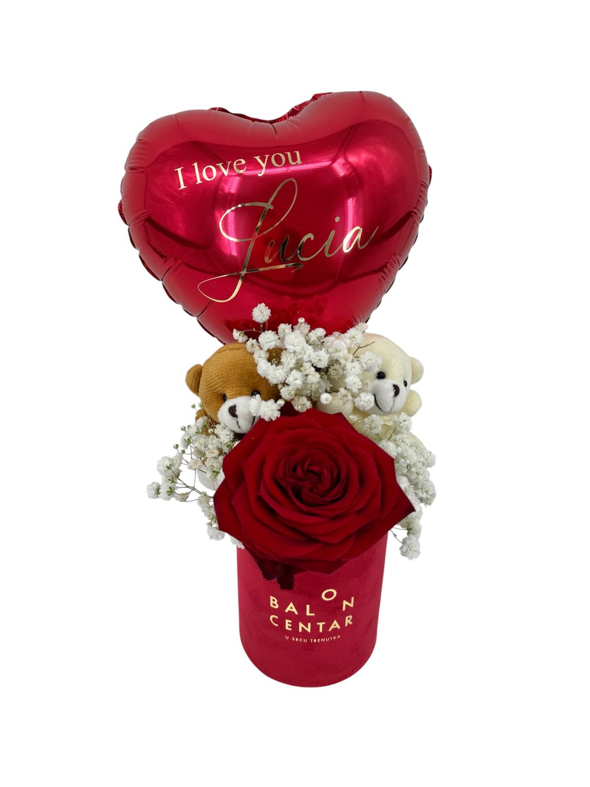 Poklon box s medekima i šlajerima romantičnog i slatkog dizajna, poseban je poklon za Valentinovo. Spoj nježnih detalja i personalizirane poruke čini ga idealnim načinom da pokažeš koliko ti je stalo. U napomenu narudžbe slobodno napiši ime ili mini tekst koji želiš da piše na balonu.